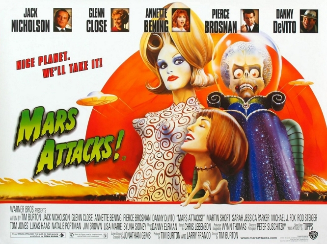 The cast here is an impressive ensemble with huge names like Glenn Close, Annette Bening, Pierce Brosnan, Danny DeVito, Michael J. Fox, Pam Grier, Rod Steiger, Natalie Portman and Jack Black. But the main star is Jack Nicholson playing two characters, the president and a sleezy casino owner. Oh, I’d better not forget that Welsh singer, Tom Jones in this this too, that’s quite unusual. It is an immense cast. Still, as impressive as the cast is, it’s really the CGI Martians that steal the show. Mars Attacks! is a brilliant throwback to that 1950s, sci-fi, B-movie genre that I adore. A dark comedy about malevolent aliens and the stupid humans who can’t a seem to grasp that the Martians have come to Earth to destroy humanity.