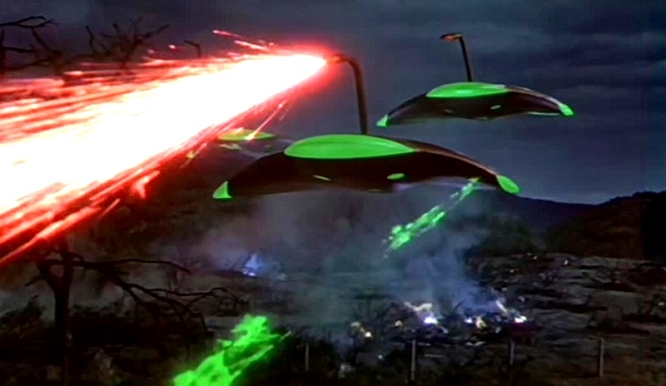It is all a bit too much “American” at times and the forced region elements do come across as terribly ham-fisted. “God bless America” and all that crap. No more iconic tripod fighting machines either. In this version the aliens have these flying ships instead. Or do they? It does seem like the machines are flying, but it has been said that they do have “invisible legs” (I’m guessing it was too costly/tricky to do convincing walking machines as a special effect in 1953?) and if you look closely when the first machine is seen fully emerging, you can see that the machine does have three legs. There are three lighting-like things. They look like they’re flying because the legs are “invisible”. At one point in the film and when hiding in a building, Dr. Forrester says, “There’s a machine standing right along side of us.” Standing, and it left footprints in the ground too. So they were tripods and not flying machines.