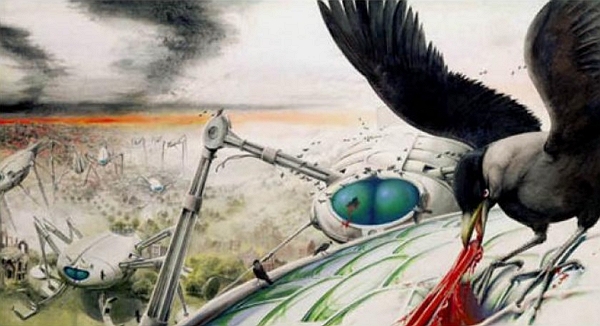 I can close my eyes right now and still see the amazing artwork of that gatefold album. The front cover of a fighting machine firing its heat ray and melting Thunder Child (farewell!) is burned into my memory for life. Opening that gatefold and seeing the image of the the first Martian cylinder landing on Horsell Common. The gloriously illustrated booklet that came with it, with key scenes of the story captured brilliantly. Parson Nathaniel holding a cross up at the fighting machines, the red weed taking over a small village, the people fleeing in terror as a fighting machine destroyed buildings, the image of the underground world envisioned by the deluded artilleryman (including cricket), the black birds pecking at and eating the now dead Martians. That booklet, I would look at that booklet all the time, even if the album wasn’t being played. I was drawn to it and the artwork by Geoff Taylor, Mike Trim, and Peter Goodfellow is timeless as it illustrated the story perfectly. A little aside, did you know that artist Roger Dean was first approached to do the art? But it didn’t work out, but Roger’s interpretation of the fighting machine tripods did eventually see the light of day.
