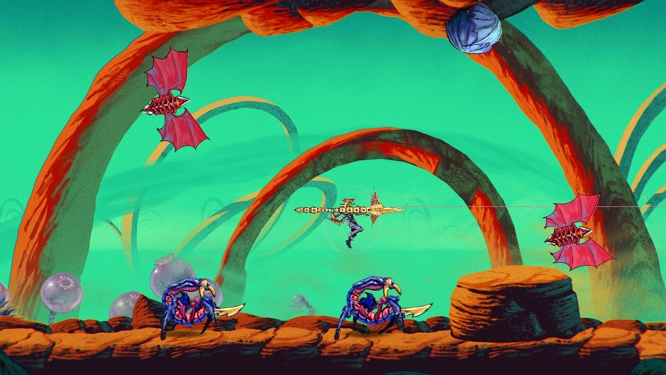 But spectacle alone doesn’t make a great game. ChainStaff’s gameplay is a cocktail of Shadow of the Beast and Turrican, with a soupçon of Bionic Commando, and Contra thrown into the mix, shaken vigorously, and served with a garnish of “remember when games didn’t care about realism?” Levels are mostly linear but peppered with secrets, optional routes, and Metroidvania‑style gating. New abilities, double jumps, waterfall swimming, gas‑cloud gliding, open up previously inaccessible areas, encouraging repeat runs for the obsessive, 100% hunters among us.